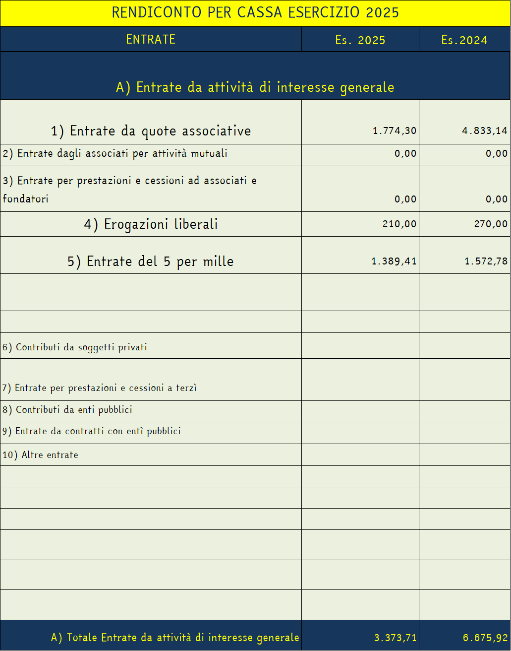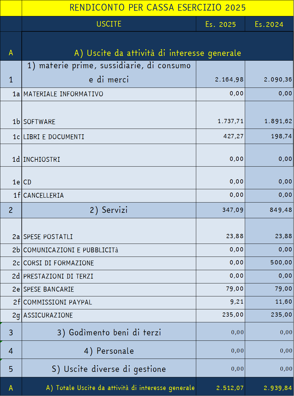 Rispetto al 2024 manca la voce CORSI DI FORMAZIONE (500 euro) essendosi concluso il ciclo di corsi tenuto l’anno precedente.
