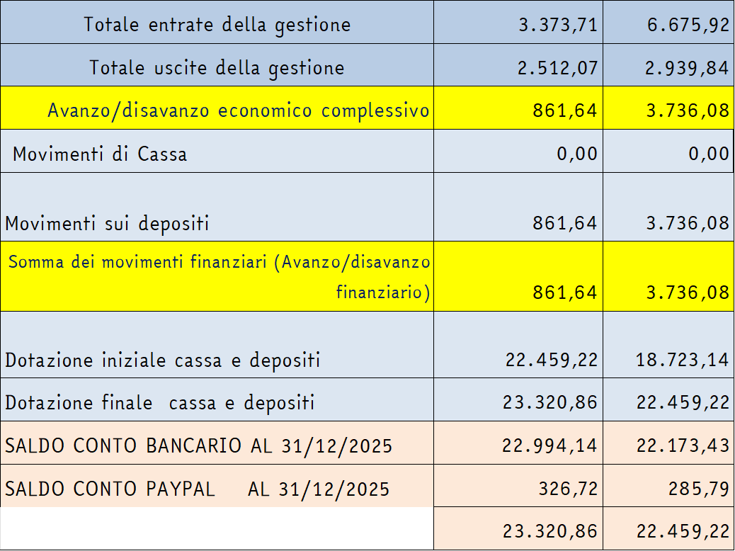 Il risultato incrementa comunque il patrimonio sociale, portandolo alla somma per noi considerevole di 23.320,86 euro, di cui (alla data del 31 dicembre): 22.994,14 in Banca e 326,72 sul conto PayPal.