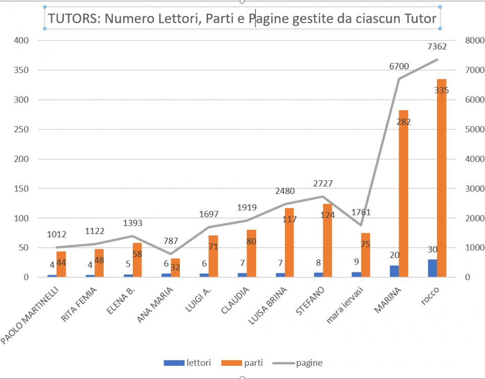 Questa relazione può essere scaricata in formato PDF da questo link ANALISI DEL LAVORO GESTITO DAI TUTORS Grandissimo è stato il ruolo dei tutors, che rappresentano la struttura portante del lavoro di lettura, e che ha avuto un ruolo importantissimo nel rendere possibile la crescita del nostro lavoro di pubblicazione […]