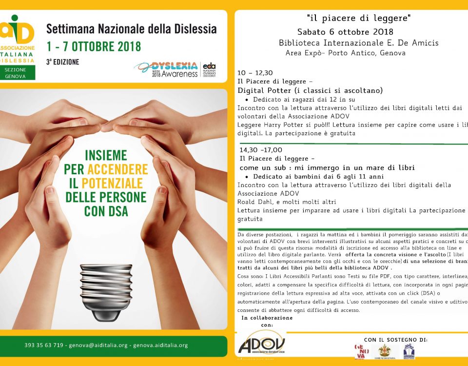 IL PIACERE DI LEGGERE Incontro con la lettura attraverso l’utilizzo dei Libri Digitali Parlanti letti dai volontari della Associazione ADOV Lettura insieme per imparare ad usare i libri digitali Sabato 6 Ottobre, nella sala Luzzati della Biblioteca De Amicis, una iniziativa per favorire l’incontro tra i volontari donatori di voce dell’ADOV […]