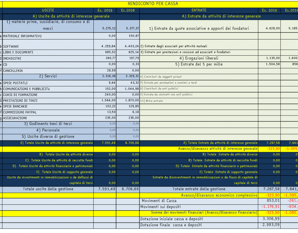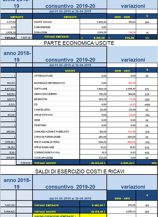 RELAZIONE DI BILANCIO ANNO maggio 2019 aprile 2020 (click per visualizzare in PDF) Il bilancio, esteso al periodo maggio-aprile, differisce notevolmente dal bilancio dell’anno 2019, dato che molti movimenti salienti di entrata e uscita sono avvenuti in prevalenza tra novembre e la fine di aprile, determinando una notevole crescita […]